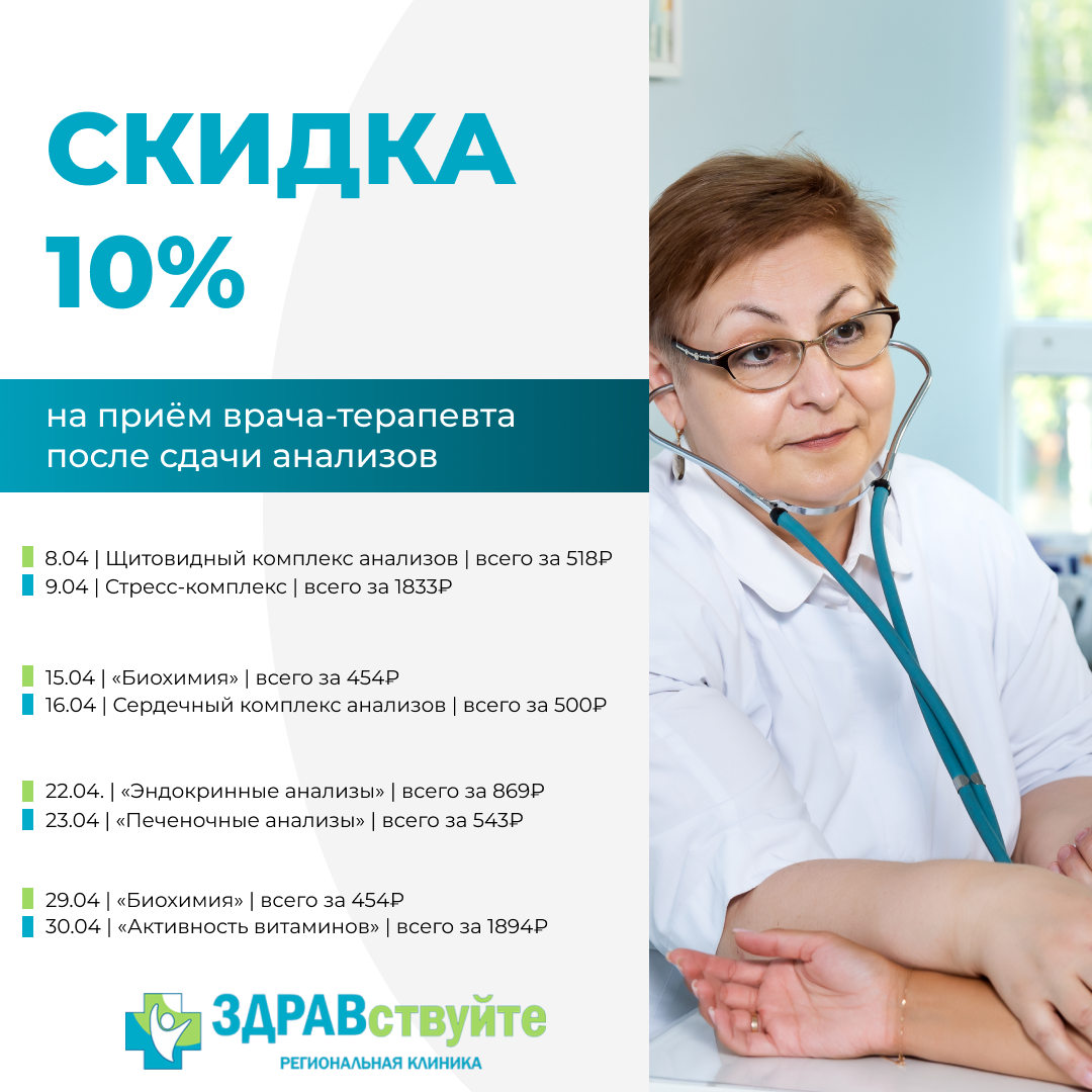 Приходите на консультацию к врачу-терапевту после сдачи анализов и получите скидку 10% на прием!